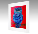 Acrylic on stretched canvas, original painting. Blue owl on red background